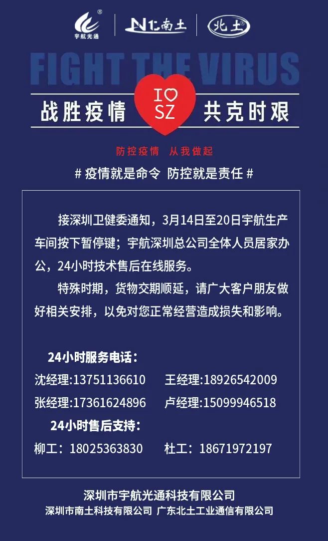 疫情就是命令,防控就是責任,接深圳衛健委通知,宇航工業交換機生產車間按下暫停鍵,給全體合作伙伴造成不便敬請諒解。暫停是為了更好的開始,深圳加油,中國加油!
