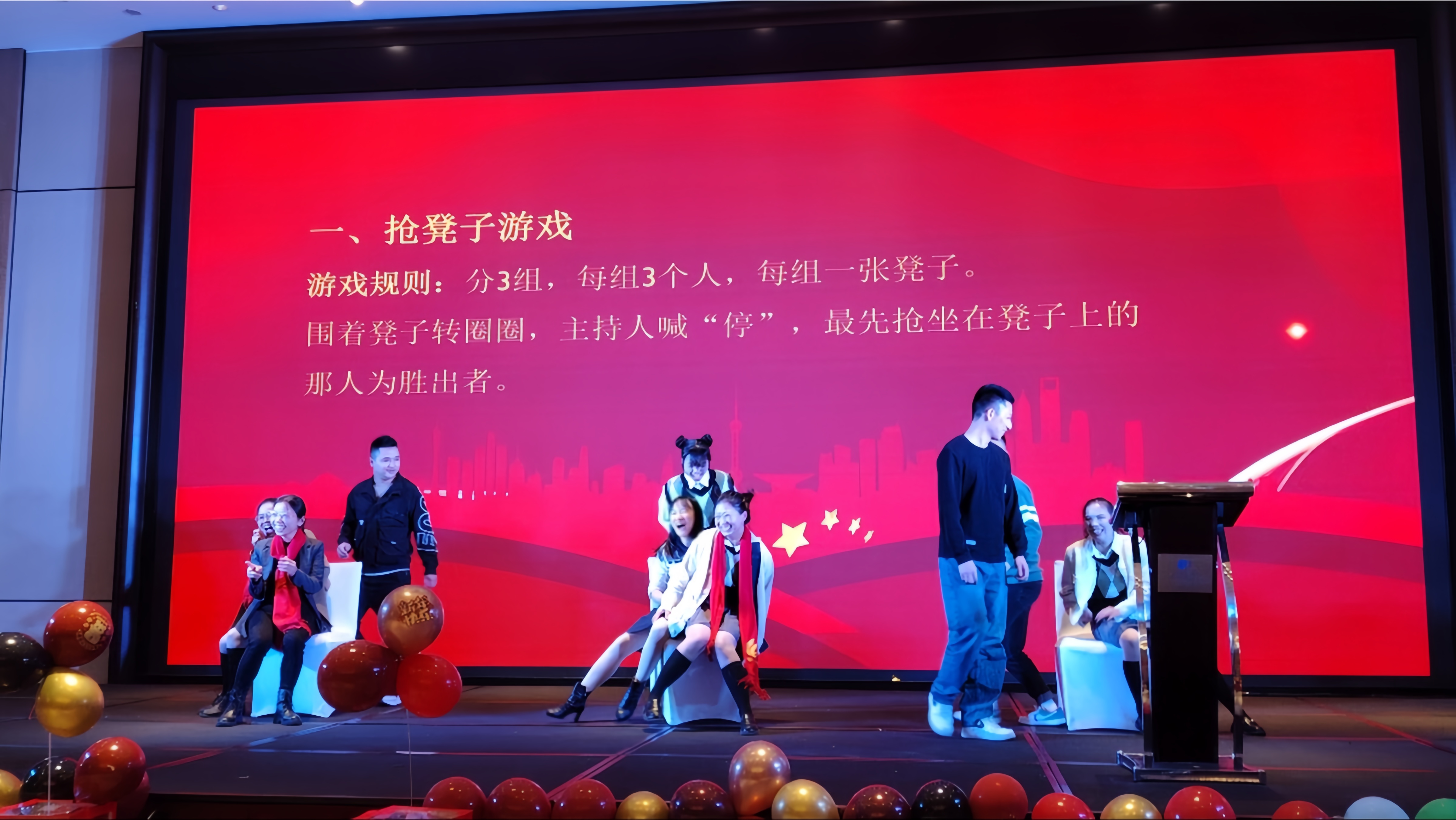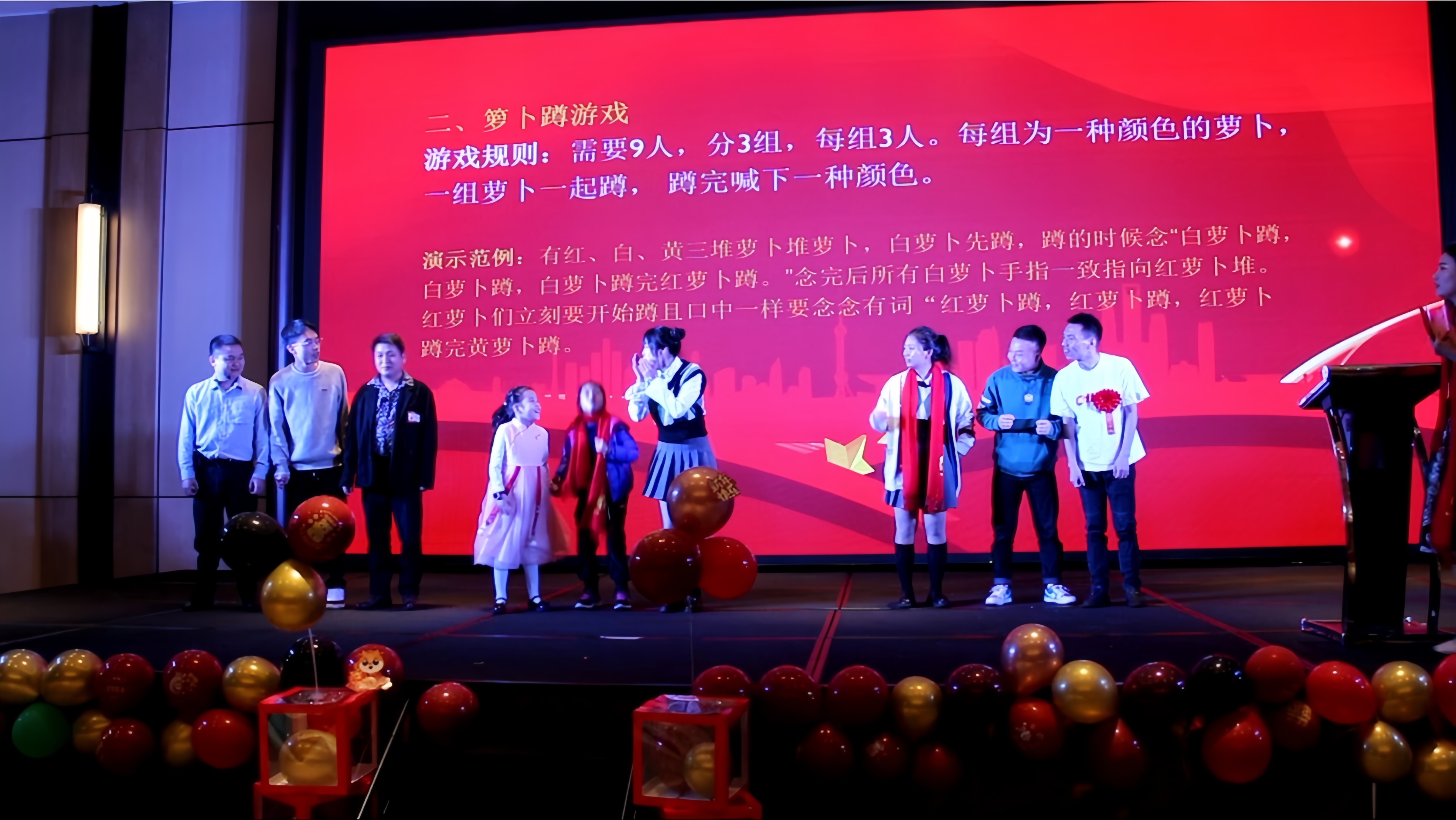 在年會(huì)的歡樂(lè)氛圍中,還有兩個(gè)充滿趣味性的游戲——搶凳子和蘿卜蹲。隨著歡快的音樂(lè)聲響起,搶凳子游戲正式開始,參與者們圍繞著凳子轉(zhuǎn)圈,眼睛緊盯著凳子,耳朵聆聽著主持的口令,當(dāng)音樂(lè)突然停止時(shí),他們需要迅速找到一個(gè)凳子坐下。一時(shí)間,現(xiàn)場(chǎng)充滿了歡笑聲和緊張的氣氛。緊接著是充滿趣味性的蘿卜蹲游戲,參與者們展現(xiàn)出活力的身姿。他們根據(jù)指定的口號(hào),一蹦一跳地輪流蹲下起立,仿佛一群活潑的蘿卜在舞動(dòng)。在這個(gè)游戲中,不僅鍛煉了身體協(xié)調(diào)能力,還考驗(yàn)著團(tuán)隊(duì)之間的默契。