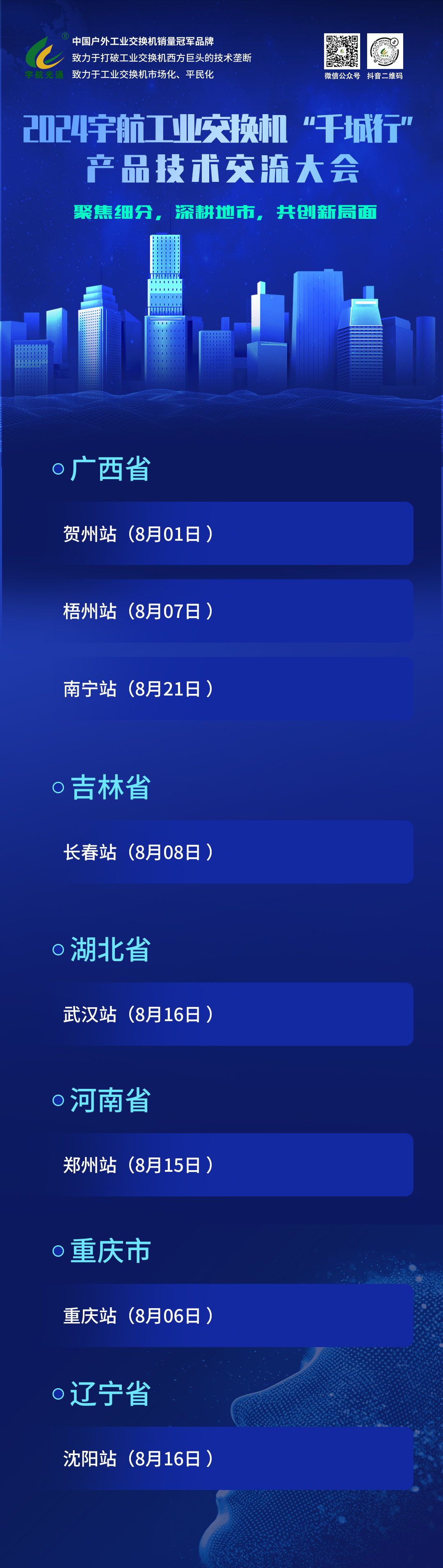 八月,宇航工業(yè)交換機將亮相國內(nèi)外多場展會(山東泰安、新疆及越南),并在廣西賀州、梧州、南寧,吉林長春,遼寧沈陽,湖北武漢,河南鄭州,重慶等城市舉辦“2024宇航工業(yè)交換機千城行產(chǎn)品技術(shù)交流大會”,深度探討行業(yè)解決方案。此外,還特別受邀參與河南鄭州、陜西西安等地的“百城會-智慧安防技術(shù)交流會”,共謀安防新未來。宇航工業(yè)交換機誠摯邀請各界精英蒞臨現(xiàn)場,參觀指導,攜手共創(chuàng)新篇章!