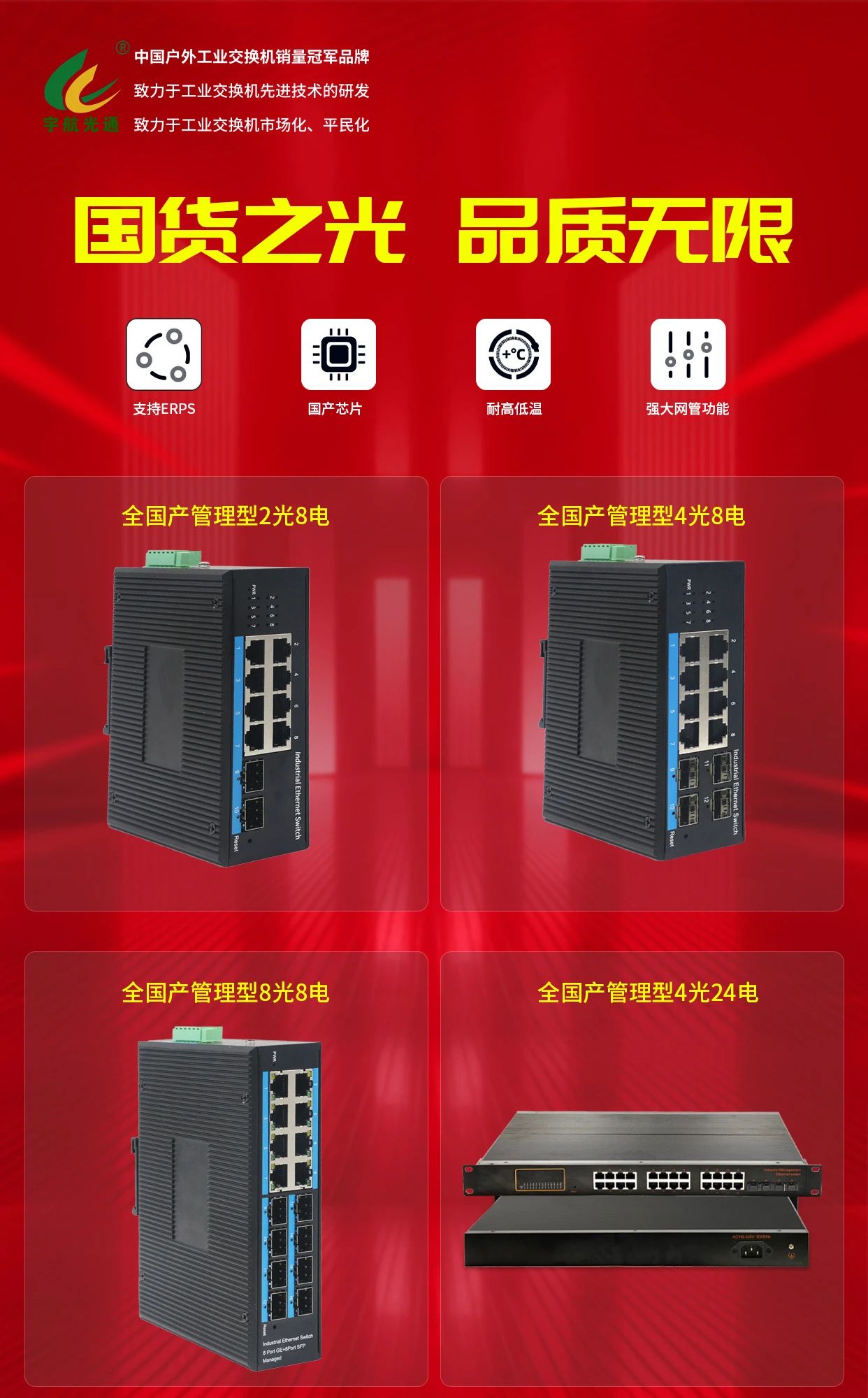 為了更好地服務于市場、服務于客戶,宇航工業(yè)交換機又一次重磅發(fā)布了全國產(chǎn)工業(yè)交換機。此次發(fā)布的全國產(chǎn)工業(yè)交換機系列,涵蓋了管理型2光8電、4光8電、8光8電、4光24電等多種規(guī)格,滿足了工業(yè)級網(wǎng)絡設備的全方位需求。這些產(chǎn)品基于全國產(chǎn)芯片設計,從硬件到軟件,完全實現(xiàn)了國產(chǎn)化替代。雖然在性能和功能上與國際頂尖水平仍有一定差距,但這一系列產(chǎn)品的推出,標志著中國在工業(yè)交換機領域的國產(chǎn)化進程邁出了堅實的一步,也表明國產(chǎn)化替代的道路正在加速。同時,不僅為中國工業(yè)網(wǎng)絡設備領域注入了新的活力,更是國產(chǎn)芯片在工業(yè)應用場景中的一次重要突破。