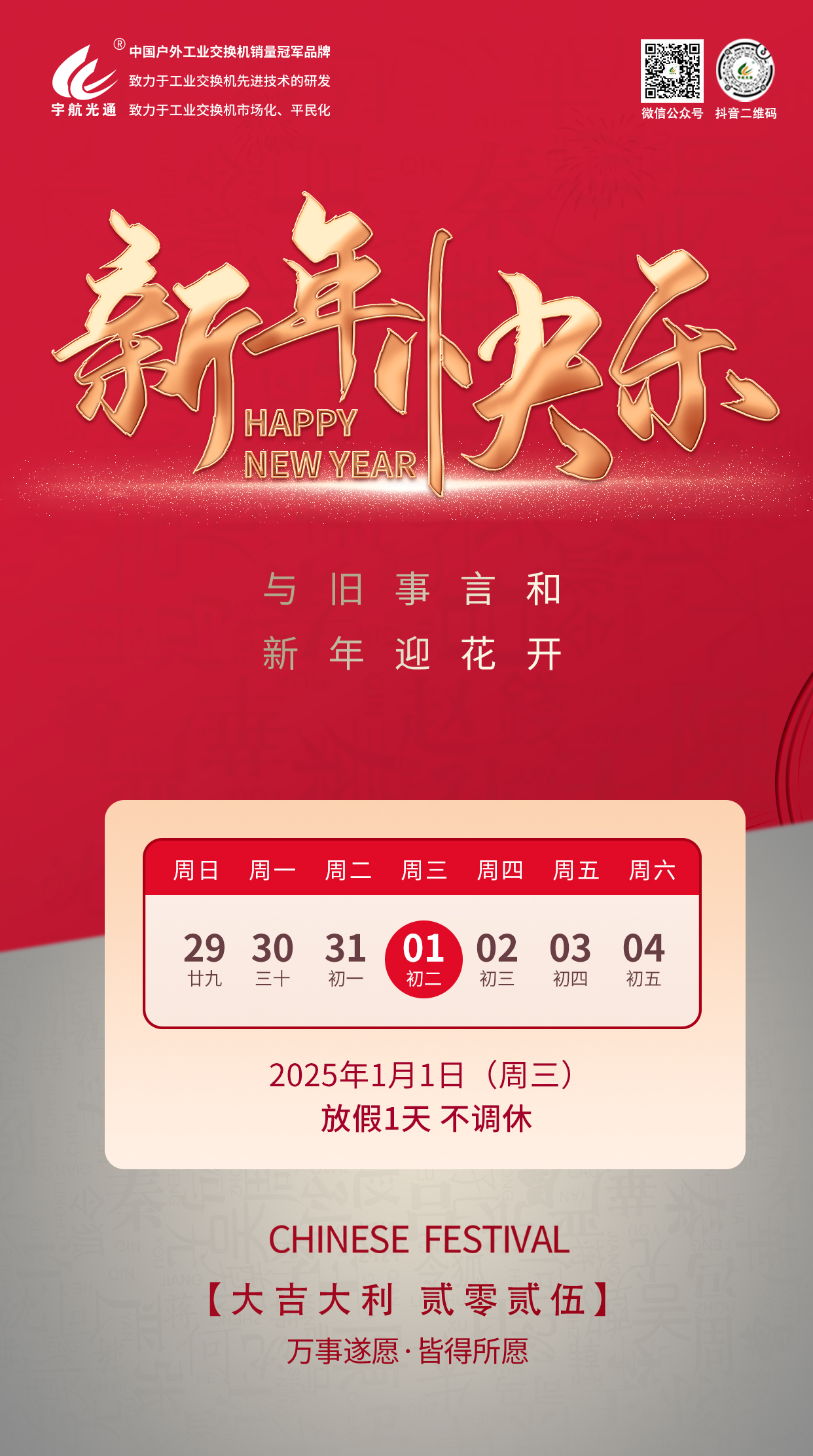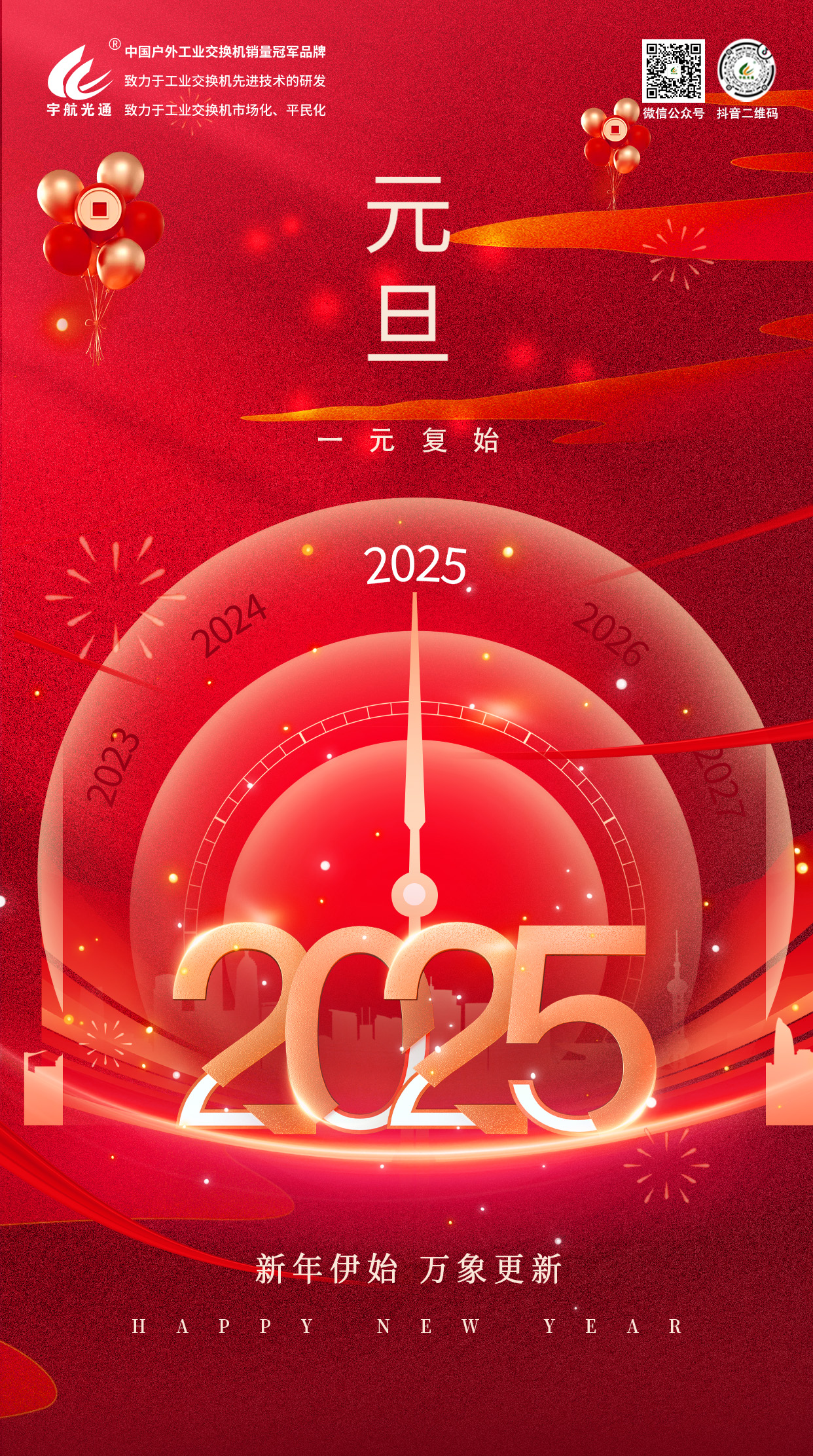 歲序更替,華章日新。闊別了充實而不尋常的2024年,我們迎來了充滿希望的2025年,值此新的一年到來之際,宇航工業(yè)交換機全體同事向社會各界領(lǐng)導(dǎo)、朋友們以及一直以來關(guān)心和支持我們的合作伙伴、供應(yīng)商表示最衷心的感謝!向辛勤付出的每一位同事致以最誠摯的敬意!