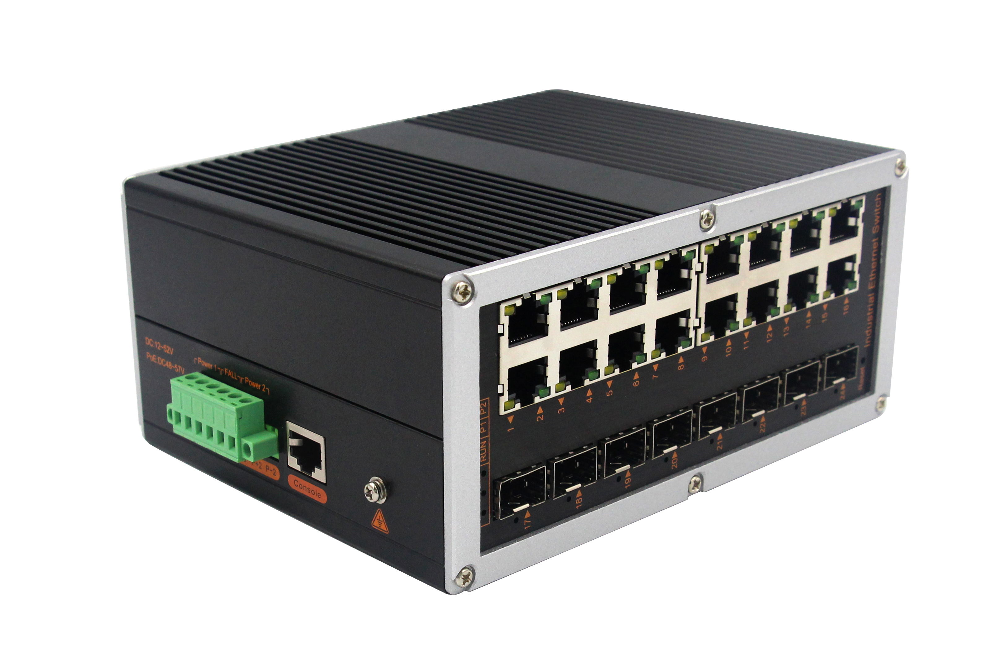 網(wǎng)管型千兆8光16電工業(yè)以太網(wǎng)交換機(jī),產(chǎn)品符合FCC、CE、ROHS標(biāo)準(zhǔn)。支持4萬(wàn)兆光+4千兆光+16千兆電口,支持一路console口;支持工業(yè)現(xiàn)場(chǎng)所需的以太網(wǎng)二層協(xié)議,保證通信網(wǎng)絡(luò)的穩(wěn)定性;該系列交換機(jī)采用低功耗、無(wú)風(fēng)扇設(shè)計(jì),確保無(wú)噪聲干擾,同時(shí)支持-40~85℃工作溫度和良好的EMC電磁兼容性能,保證在惡劣的工業(yè)環(huán)境中保持穩(wěn)定的工作,為工廠自動(dòng)化,智能交通,視頻監(jiān)控等工業(yè)應(yīng)用領(lǐng)域組建快速穩(wěn)定的網(wǎng)絡(luò)終端接入網(wǎng)絡(luò)提供安全可靠的解決方案。護(hù)等級(jí)的外殼及 LED 指示燈,使之成為一個(gè)即插即用的工業(yè)級(jí)設(shè)備,為用戶的以太網(wǎng)設(shè)備聯(lián)網(wǎng)提供可靠、便捷的解決方案。