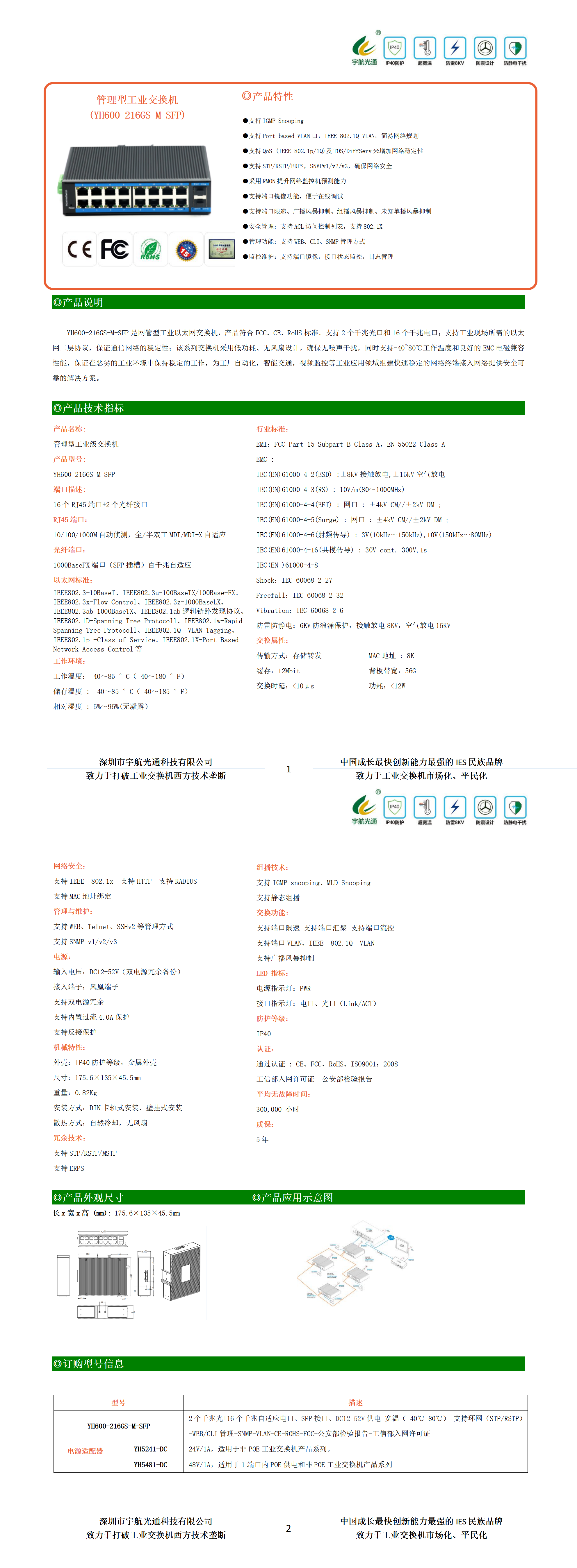 YH600-216GS-M-SFP是網(wǎng)管型工業(yè)以太網(wǎng)交換機,產(chǎn)品符合FCC、CE、RoHS標準。支持2個千兆光口和16個千兆電口;支持工業(yè)現(xiàn)場所需的以太網(wǎng)二層協(xié)議,保證通信網(wǎng)絡的穩(wěn)定性;該系列交換機采用低功耗、無風扇設計,確保無噪聲干擾,同時支持-40~80℃工作溫度和良好的EMC電磁兼容性能,保證在惡劣的工業(yè)環(huán)境中保持穩(wěn)定的工作,為工廠自動化,智能交通,視頻監(jiān)控等工業(yè)應用領域組建快速穩(wěn)定的網(wǎng)絡終端接入網(wǎng)絡提供安全可靠的解決方案。